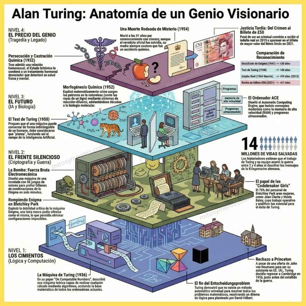 Alan Turing fue el matemático más influyente del siglo XX, aunque el mundo tardó décadas en reconocerlo. Nacido en Londres en 1912, pasó de ser un niño superdotado incomprendido por el sistema educativo inglés a diseñar la teoría que haría posibles todos los ordenadores que existen hoy. Durante la Segunda Guerra Mundial trabajó en secreto en Bletchley Park y rompió el cifrado de la máquina Enigma, acortando la guerra en al menos dos años y salvando, según los historiadores, entre diez y catorce millones de vidas. El precio que pagó fue devastador: condenado en 1952 por "indecencia grave", fue sometido a castración química y murió a los 41 años en circunstancias que aún generan debate. En 2013, la Corona Británica le concedió el indulto póstumo. Demasiado tarde.